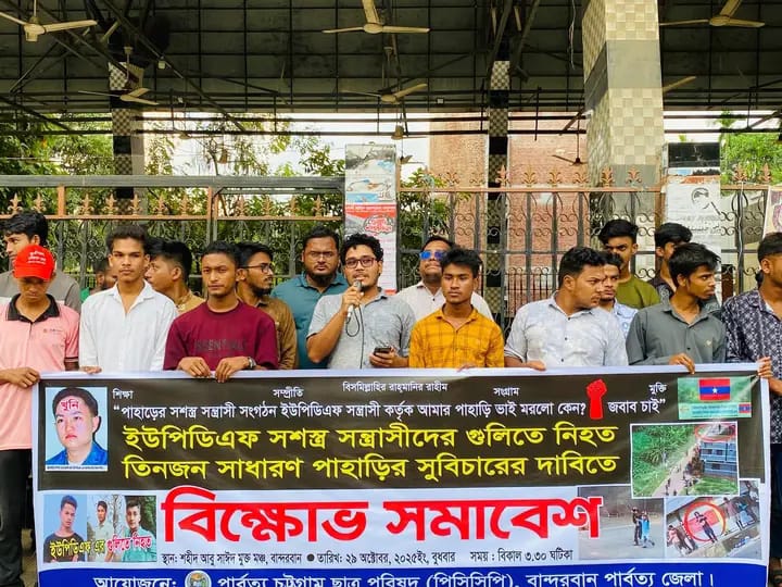ইউপিডিএফের গুলিতে নিহত তিনজন পাহাড়ি হত্যার বিচারের দাবিতে বান্দরবানে পিসিসিপির বিক্ষোভ