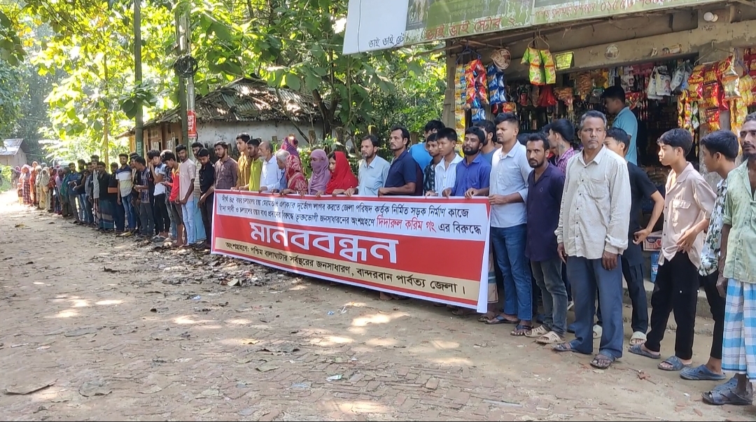 বান্দরবানে সড়ক নির্মাণে বাঁধা প্রদানসহ চাঁদা দাবীর প্রতিবাদে এলাকাবাসীর মানববন্ধন।