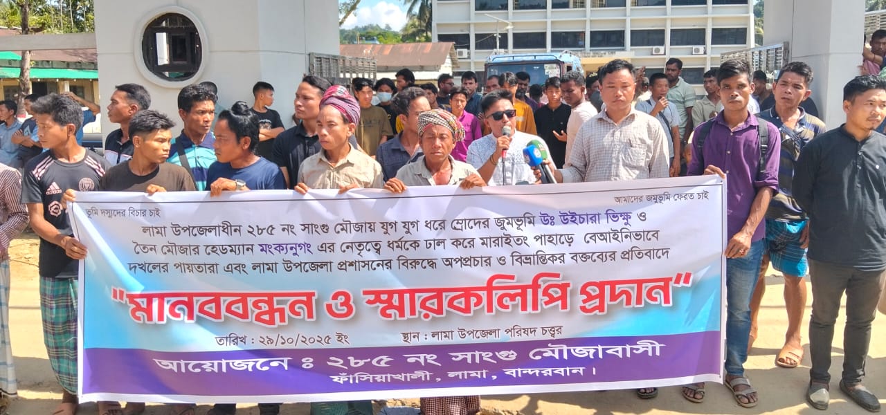 লামায় ধর্মীয় প্রতিষ্ঠানের নামে পাহাড় দখলের অভিযোগ, ম্রো জনগোষ্ঠীর মানববন্ধন